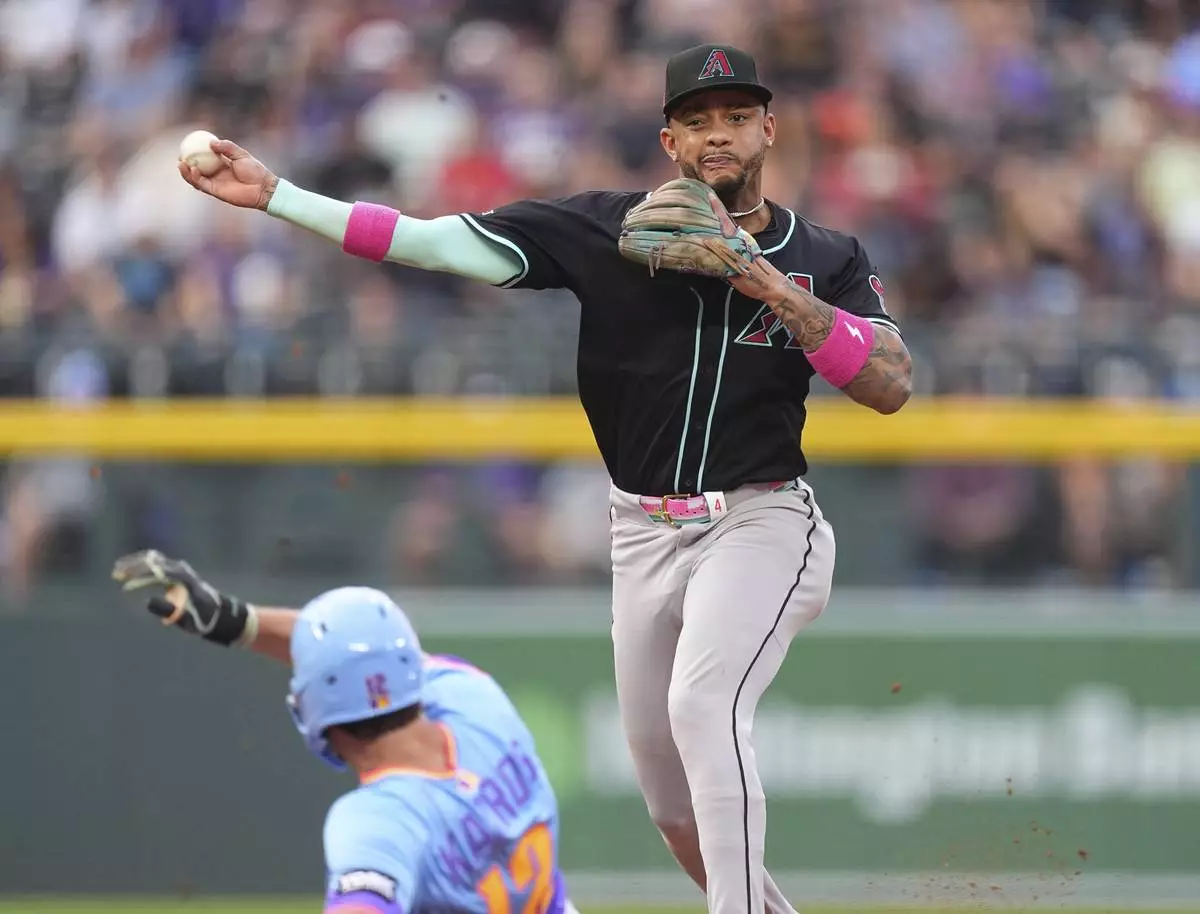 Arizona Diamondbacks second baseman Ketel Marte, back, throws over Colorado Rockies' Kyle Karros after forcing him out at second base on the front end of a double play hit into by Brenton Doyle in the second inning of a baseball game Friday, Aug. 15, 2025, in Denver. (AP Photo/David Zalubowski)