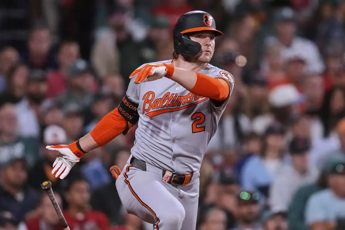 Baltimore Orioles' Gunnar Henderson watches the flight of his RBI triple during the seventh inning of a baseball game against the Boston Red Sox at Fenway Park, Monday, Aug. 18, 2025, in Boston. (AP Photo/Charles Krupa)