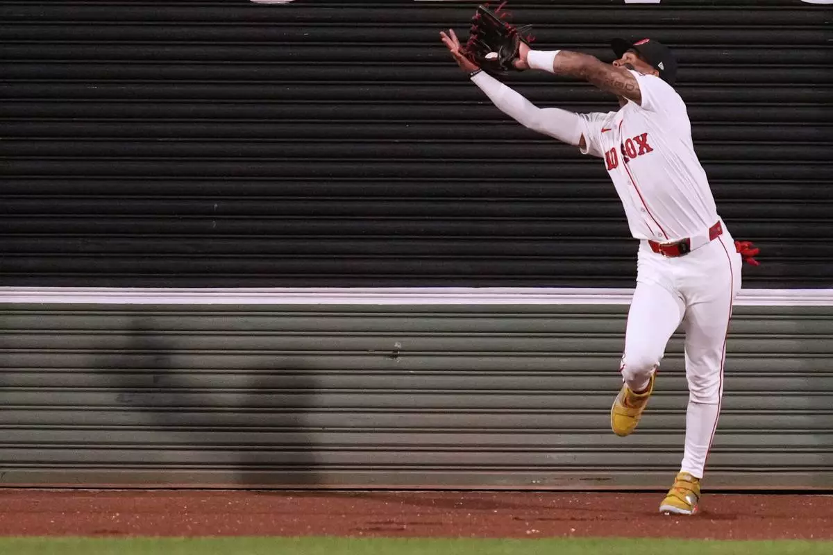 Boston Red Sox outfielder Ceddanne Rafaela catches a flyout hit by Baltimore Orioles' Ryan Mountcastle during the fifth inning of a baseball game at Fenway Park, Monday, Aug. 18, 2025, in Boston. (AP Photo/Charles Krupa)