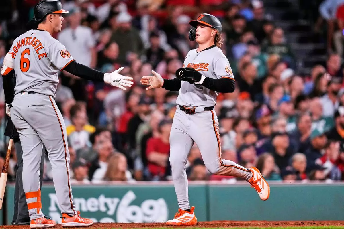 Baltimore Orioles' Jackson Holliday, right, is congratulated by Ryan Mountcastle (6) after scoring on a triple by Gunnar Henderson during the seventh inning of a baseball game against the Boston Red Sox at Fenway Park, Monday, Aug. 18, 2025, in Boston. (AP Photo/Charles Krupa)