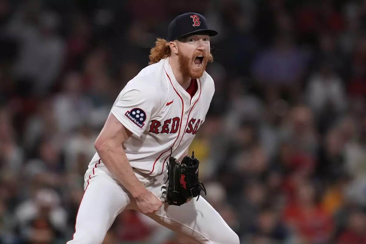 Boston Red Sox pitcher Dustin May reacts after the final out of the top of the sixth inning of a baseball game against the Baltimore Orioles at Fenway Park, Monday, Aug. 18, 2025, in Boston. (AP Photo/Charles Krupa)