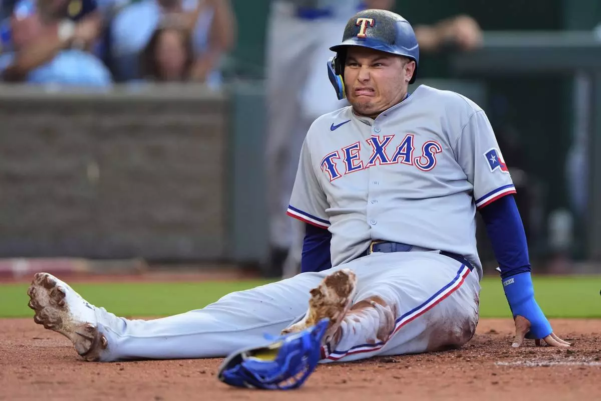 Texas Rangers' Joc Pederson reacts after getting the second out of a double play as he tried to score on fly out hit by Josh Smith during the second inning of a baseball game against the Kansas City Royals, Monday, Aug. 18, 2025, in Kansas City, Mo. (AP Photo/Charlie Riedel)