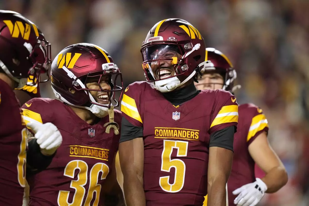 Washington Commanders quarterback Jayden Daniels (5) is congratulated by teammate Chris Rodriguez Jr. (36) after scoring during the first half of a preseason NFL football game Monday, Aug. 18, 2025, in Landover, Md. (AP Photo/Stephanie Scarbrough)