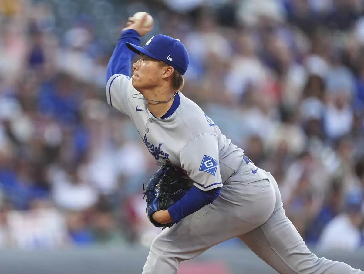Los Angeles Dodgers starting pitcher Yoshinobu Yamamoto works against the Colorado Rockies in the first inning of a baseball game, Monday, Aug. 18, 2025, in Denver. (AP Photo/David Zalubowski)