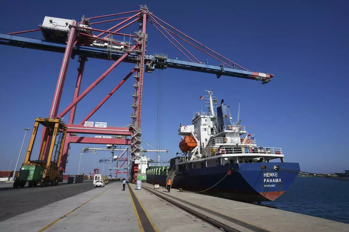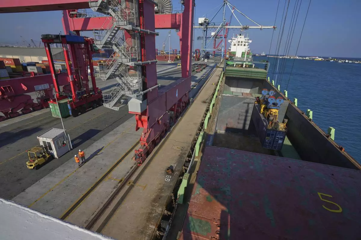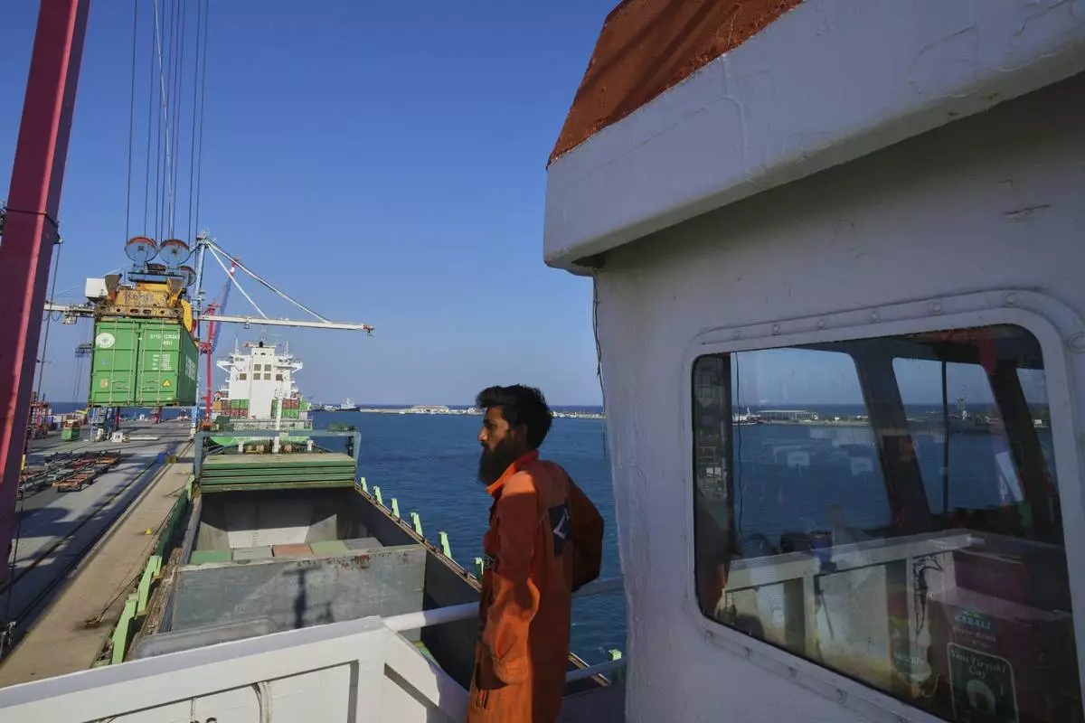 Jalal Uddin, electrical and technology officer aboard a Panamanian-flagged ship watches as containers filled with humanitarian aid for the people of Gaza are being loaded aboard the vessel at Cyprus' main port in Limassol, on Monday, Aug. 18, 2025. (AP Photo/Petros Karadjias)