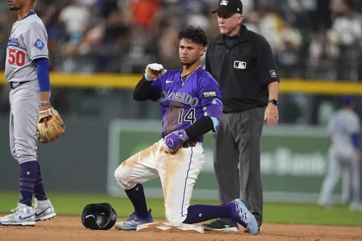Colorado Rockies' Ezequiel Tovar (14) gestures to the dugout after reaching second base on a double off Los Angeles Dodgers relief pitcher Justin Wrobleski in the ninth inning of a baseball game Monday, Aug. 18, 2025, in Denver. (AP Photo/David Zalubowski)