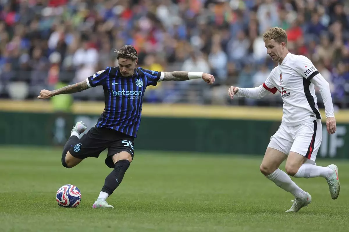 FILE -Inter Milan's Nicola Zalewski, left, attempts a shot on goal as Urawa Red Diamonds' Samuel Gustafson tries to block during the Club World Cup Group E soccer match between Inter Milan and Urawa Red Diamonds in Seattle, June 21, 2025. (AP Photo/Ryan Sun), File)