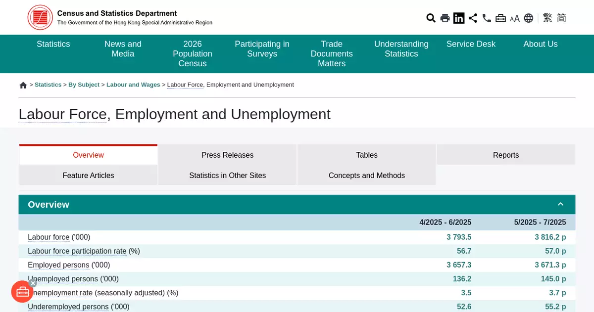 According to the latest labour force statistics (i.e. provisional figures for May - July 2025) released today (August 19) by the Census and Statistics Department (C&SD), the seasonally adjusted unemployment rate increased from 3.5% in April - June 2025 to 3.7% in May - July 2025. The underemployment rate remained unchanged at 1.4% in the two periods.