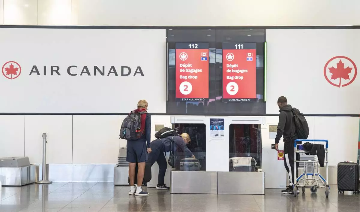 Air Canada travellers load their luggage at Montreal-Pierre Elliott Trudeau International Airport in Dorval, Que., on Tuesday, Aug. 19, 2025. (Christinne Muschi/The Canadian Press via AP)