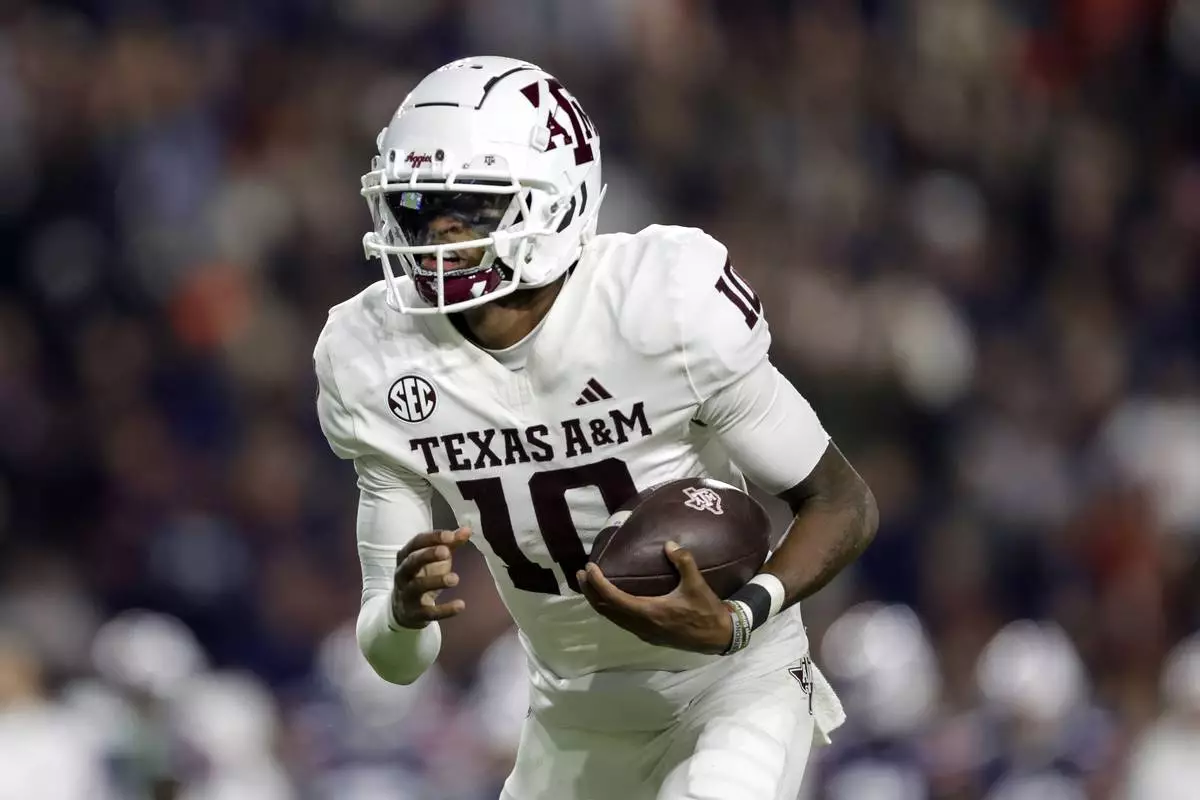 FILE - Texas A&M's Marcel Reed (10) runs with the ball during the first half of an NCAA college football game against Auburn, Saturday, Nov. 23, 2024, in Auburn, Ala. (AP Photo/Stew Milne,File)