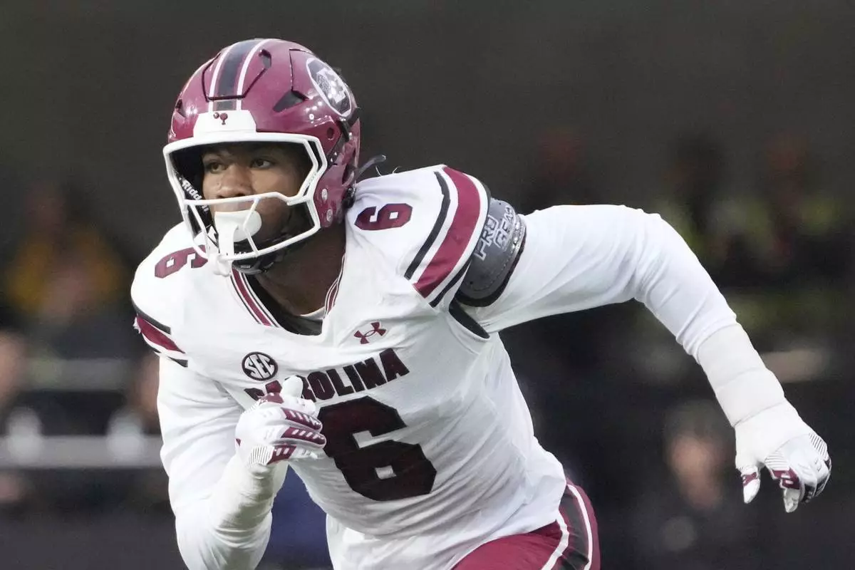 FILE - South Carolina edge Dylan Stewart (6) plays against Vanderbilt during an NCAA football game on Saturday, Nov. 9, 2024, in Nashville, Tenn. (AP Photo/Mark Humphrey, File)