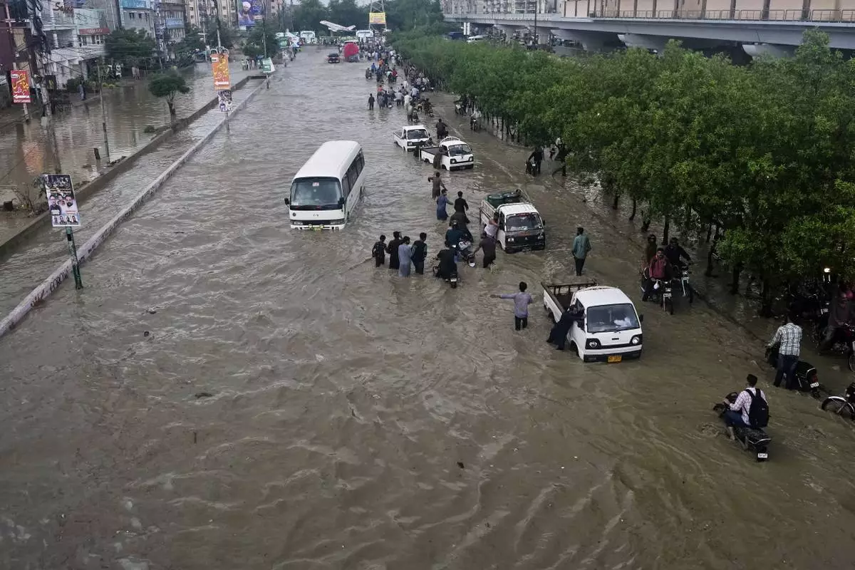 Drivers push their vehicles through a flooded road after heavy rainfall in Karachi, Pakistan, Tuesday, Aug. 19, 2025. (AP Photo/Fareed Khan)
