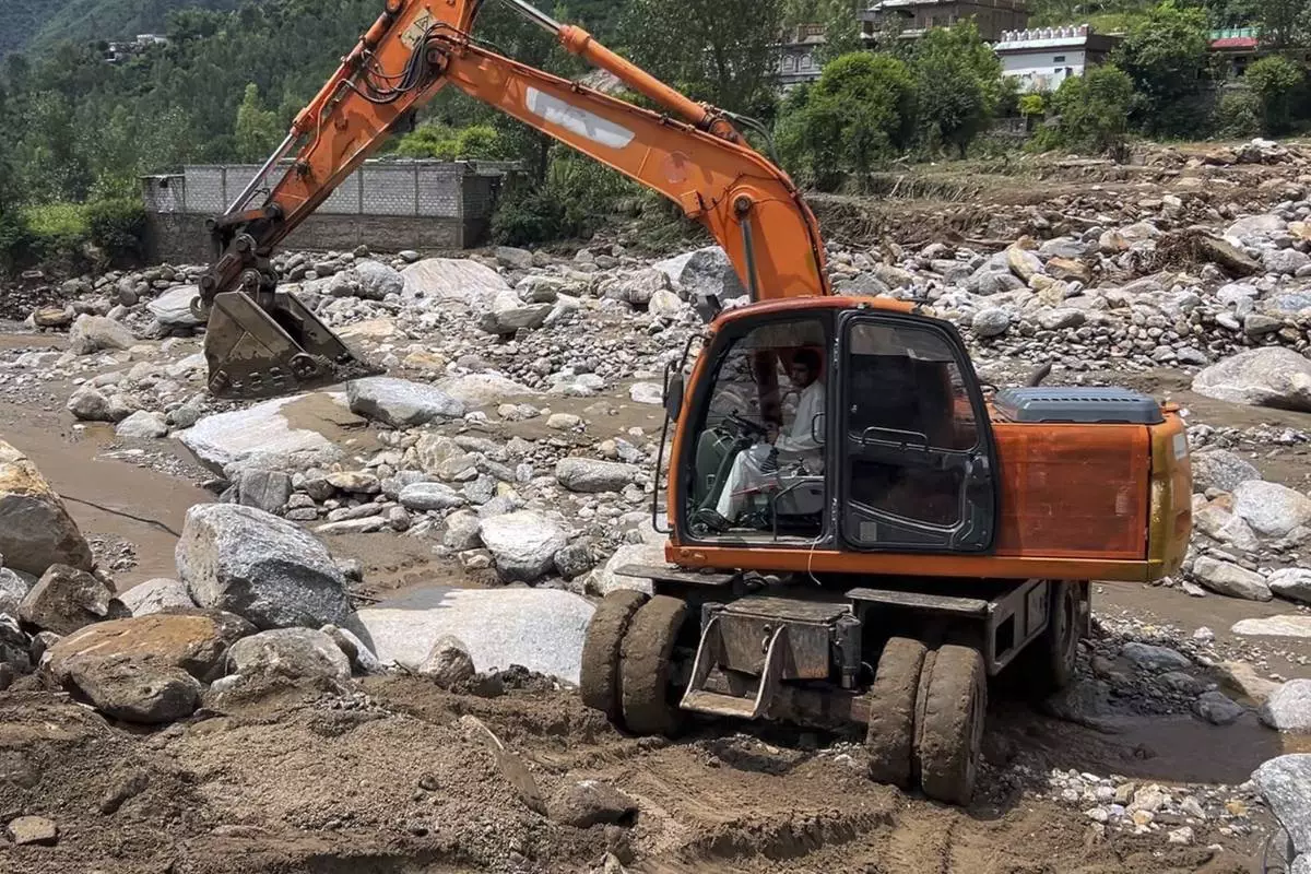 A worker with excavator clear an area filled with rocks after Friday's flash flood hit the area of Qadar Nagar in Buner district, in Pakistan's northwest, Monday, Aug. 18, 2025. (AP Photo/Mohammad Arif)
