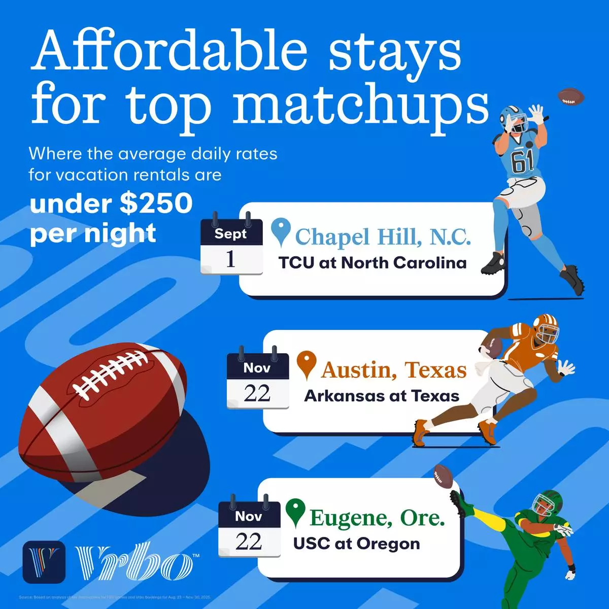 This season's notable matchups have driven early demand for vacation rentals near college campuses. From anticipated playoff rematches to in-conference rivalries, demand more than doubled for four out of the five leading destinations: 2