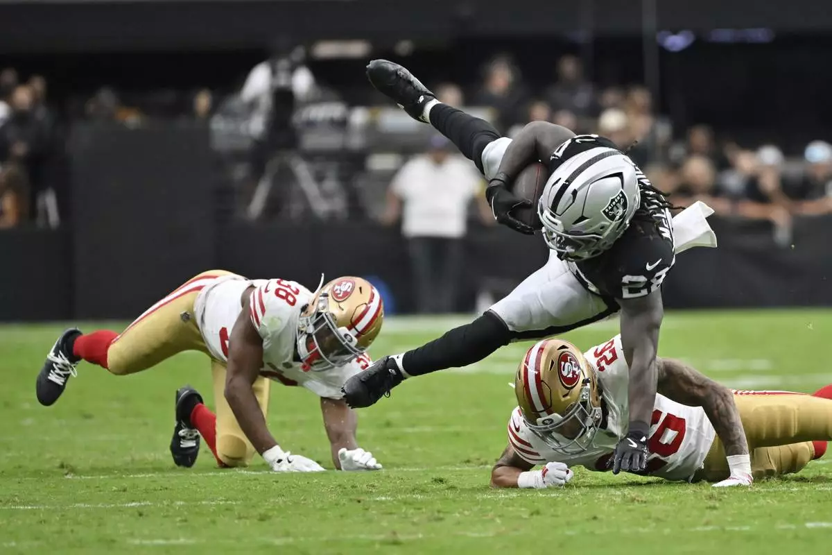 Las Vegas Raiders running back Sincere McCormick (28) leaps over San Francisco 49ers cornerback Chase Lucas (26) of a preseason NFL football game Saturday, Aug. 16, 2025, in Las Vegas. (AP Photo/David Becker)