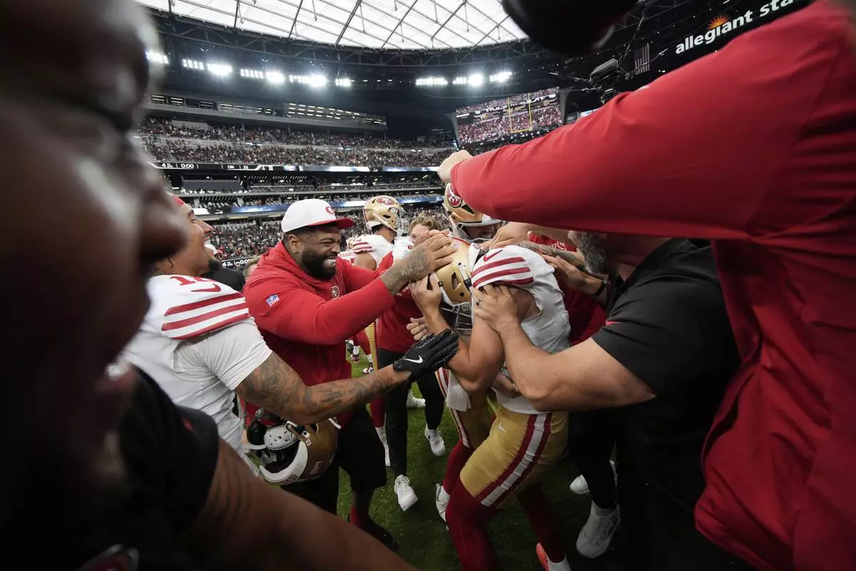 San Francisco 49ers place kicker Jake Moody is mobbed by teammates after making the game-winning field goal in a preseason NFL football game against the Las Vegas Raiders, Saturday, Aug. 16, 2025, in Las Vegas. (AP Photo/John Locher)