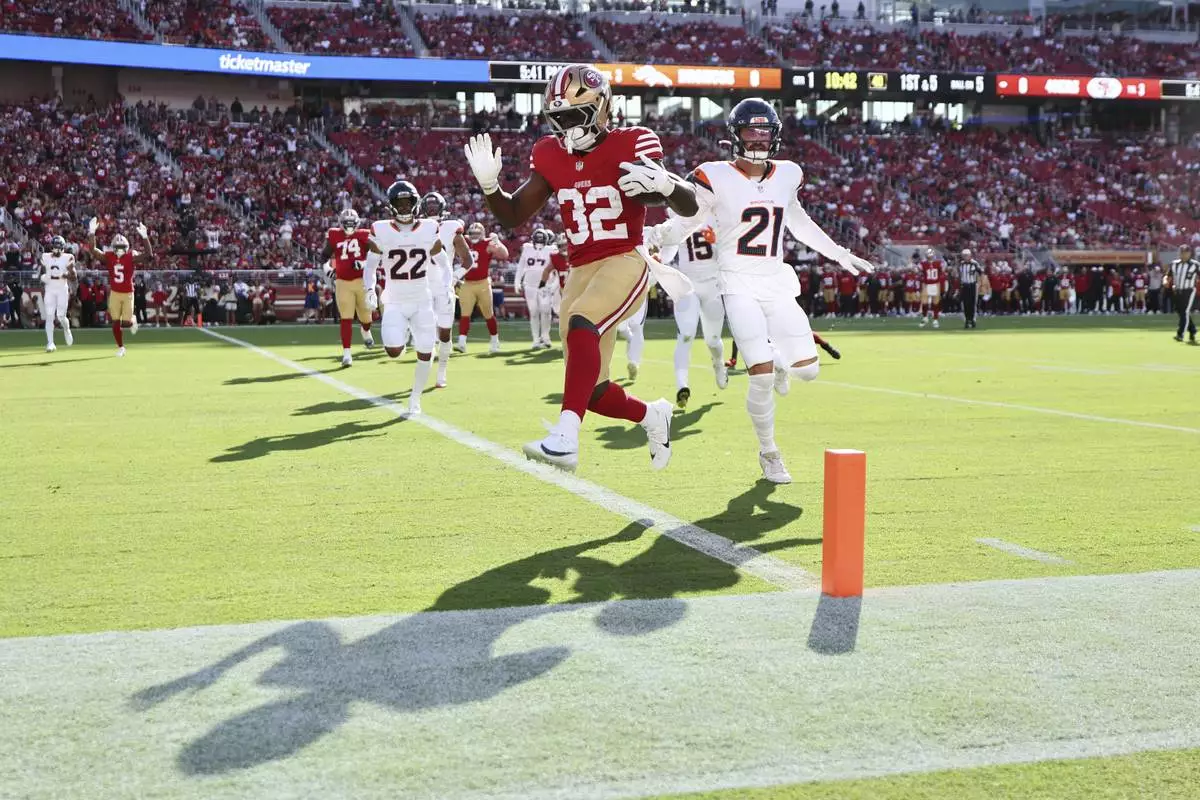 San Francisco 49ers running back Patrick Taylor Jr. (32) scores a touchdown during the first half of a preseason NFL football game against the Denver Broncos, Saturday, Aug. 9, 2025, in Santa Clara, Calif. (AP Photo/Kelley L Cox)