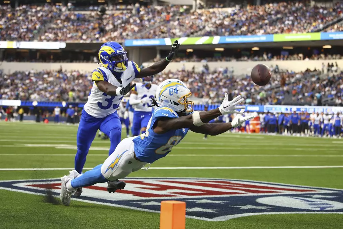 Los Angeles Chargers wide receiver KeAndre Lambert-Smith (84) cannot catch a pass in the end zone in front of Los Angeles Rams cornerback Cam Lampkin (33) during the first half of an NFL preseason football game, Saturday, Aug. 16, 2025, in Inglewood, Calif. (AP Photo/Jessie Alcheh)