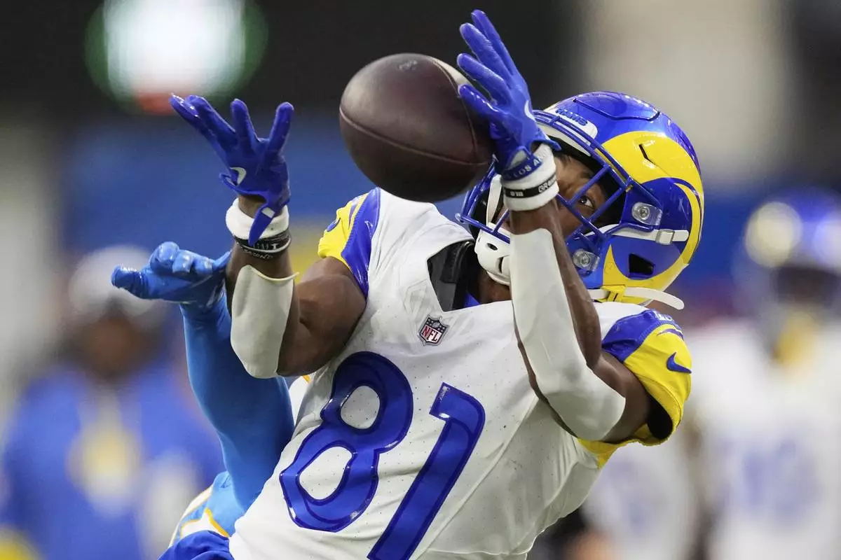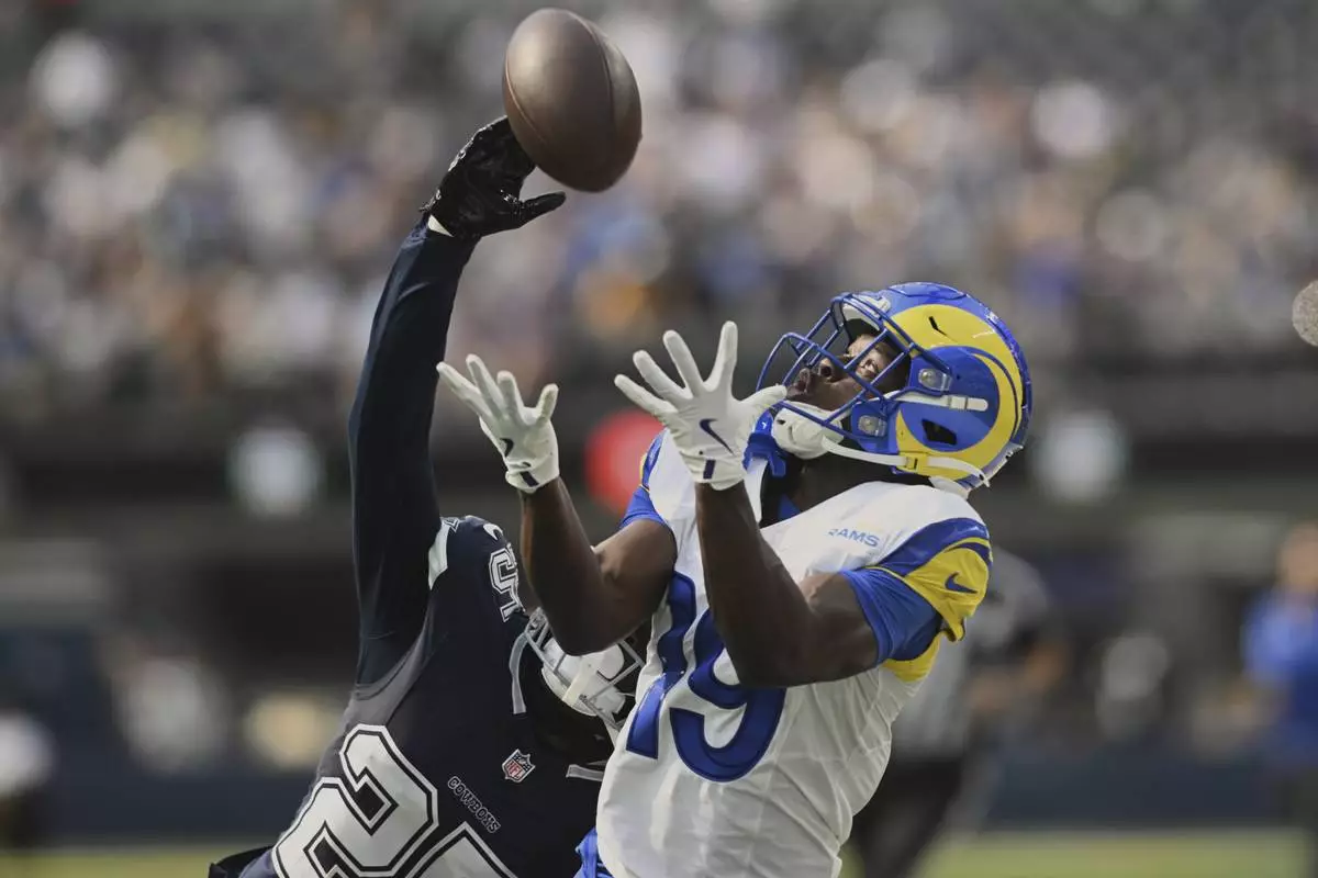 Los Angeles Rams wide receiver Xavier Smith (19) makes a catch against the Dallas Cowboys during the first half of an NFL preseason football game, Saturday, Aug. 9, 2025, in Inglewood, Calif. (AP Photo/Wally Skalij)