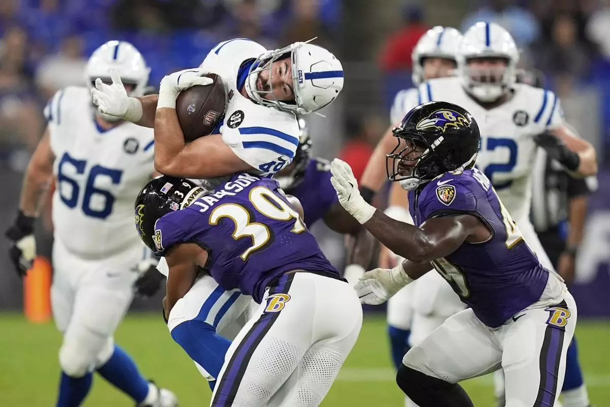 Indianapolis Colts tight end Sean McKeon, top left, is hit by Baltimore Ravens safety Keondre Jackson (39) as teammate Jay Higgins IV, right, helps defend during the second half of an NFL preseason football game Thursday, Aug. 7, 2025, in Baltimore. (AP Photo/Alex Brandon)