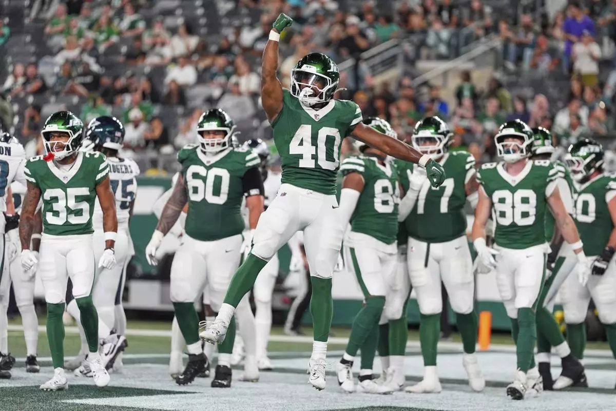 New York Jets running back Donovan Edwards (40) celebrates his touchdown in the second half of a preseason NFL football game against the Philadelphia Eagles in East Rutherford, N.J., Friday, Aug. 22, 2025. (AP Photo/Yuki Iwamura)