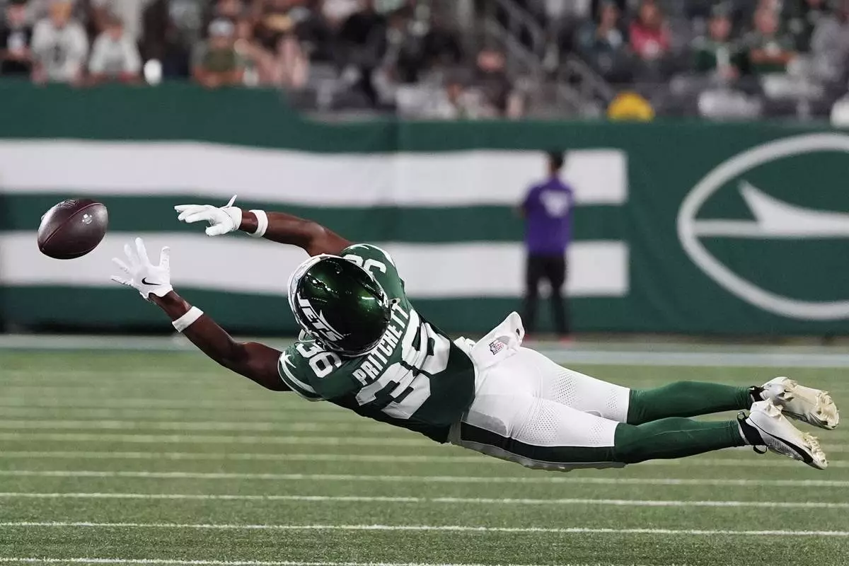 New York Jets wide receiver Jamaal Pritchett dives for a pass in the second half of a preseason NFL football game against the Philadelphia Eagles in East Rutherford, N.J., Friday, Aug. 22, 2025. (AP Photo/Yuki Iwamura)