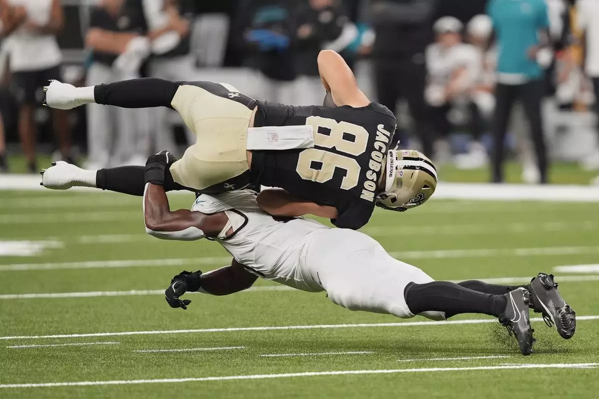 New Orleans Saints tight end Michael Jacobson (86) is upended by Jacksonville Jaguars linebacker Ventrell Miller after a reception in the second half of an NFL preseason football game in New Orleans, Sunday, Aug. 17, 2025. (AP Photo/Gerald Herbert)