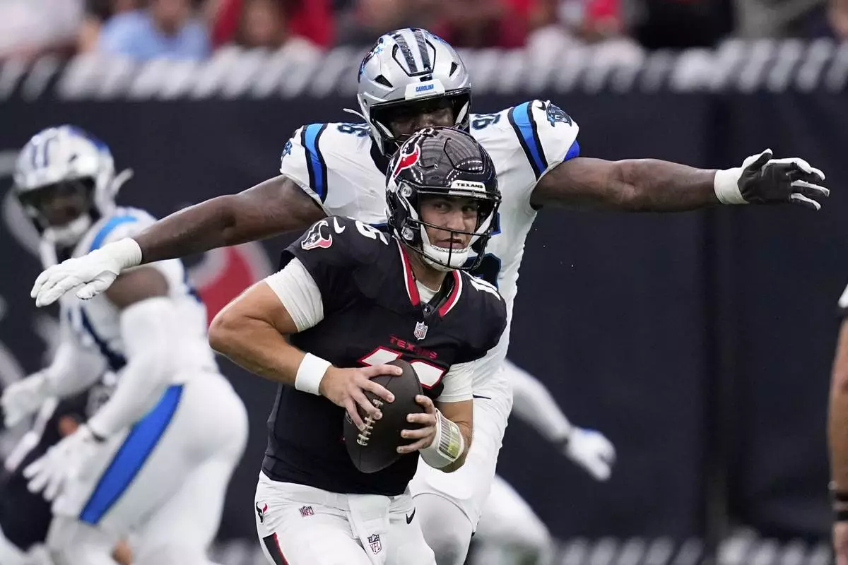 Houston Texans quarterback Kedon Slovis avoids getting sacked by Carolina Panthers defensive tackle Jaden Crumedy during the second half of an NFL preseason football game on Saturday, Aug. 16, 2025, in Houston. (AP Photo/David J. Phillip)