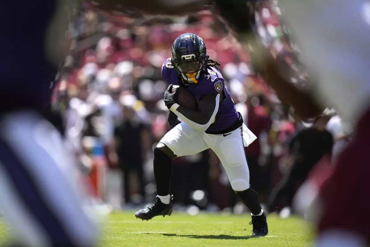 Baltimore Ravens running back D'Ernest Johnson runs with the ball during the first half of a preseason NFL football game against the Washington Commanders Saturday, Aug. 23, 2025, in Landover, Md. (AP Photo/Stephanie Scarbrough)