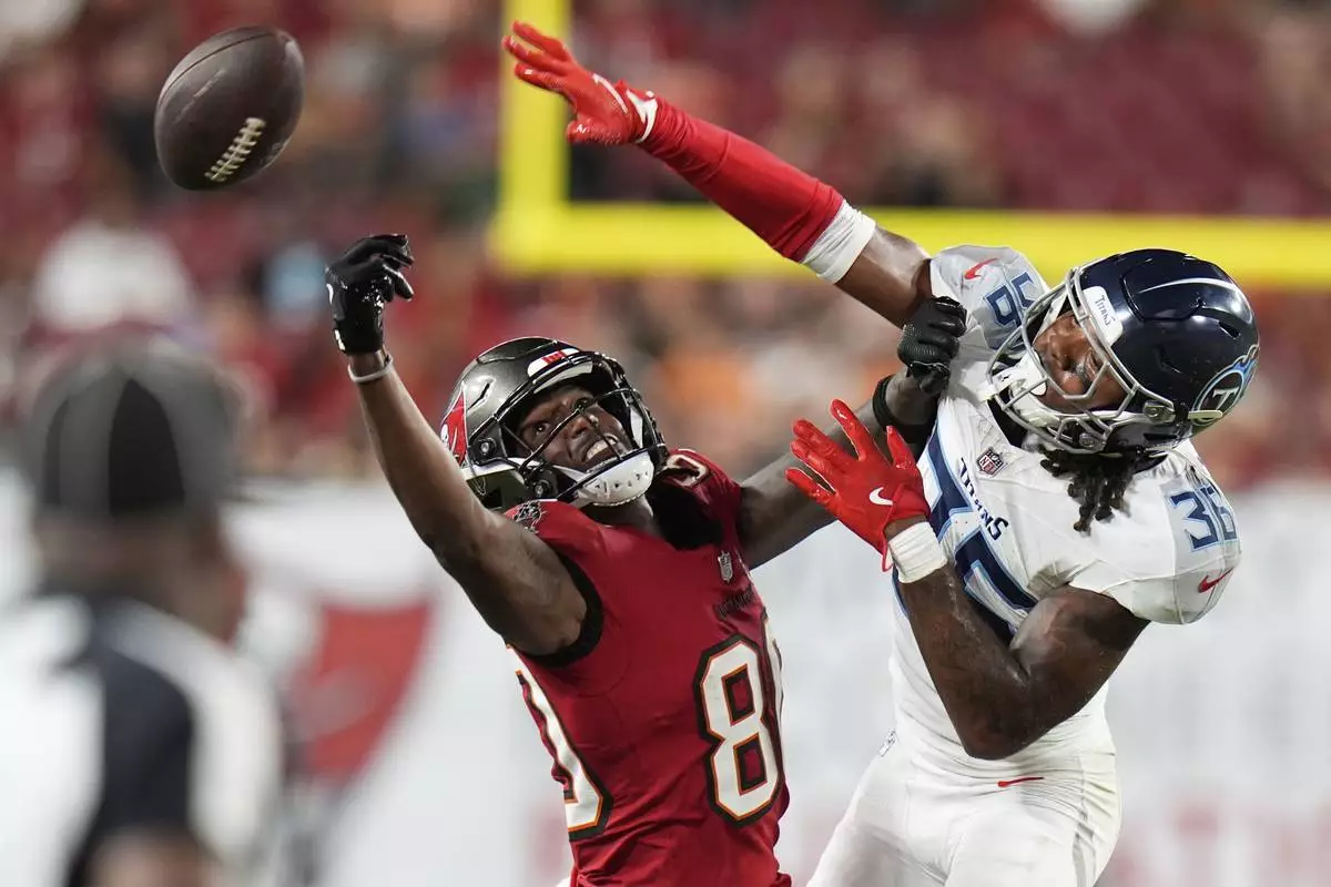 Tennessee Titans cornerback Clarence Lewis breaks up a pass intended for Tampa Bay Buccaneers wide receiver Jaden Smith during the second half of an NFL preseason football game on Saturday, Aug. 9, 2025, in Tampa, Fla. (AP Photo/Chris O'Meara)