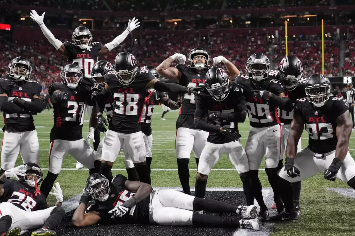 The Atlanta Falcons defense celebrates an interception by cornerback Natrone Brooks during the first half of a preseason NFL football game against the Tennessee Titans, Friday, Aug. 15, 2025, in Atlanta. (AP Photo/Brynn Anderson)