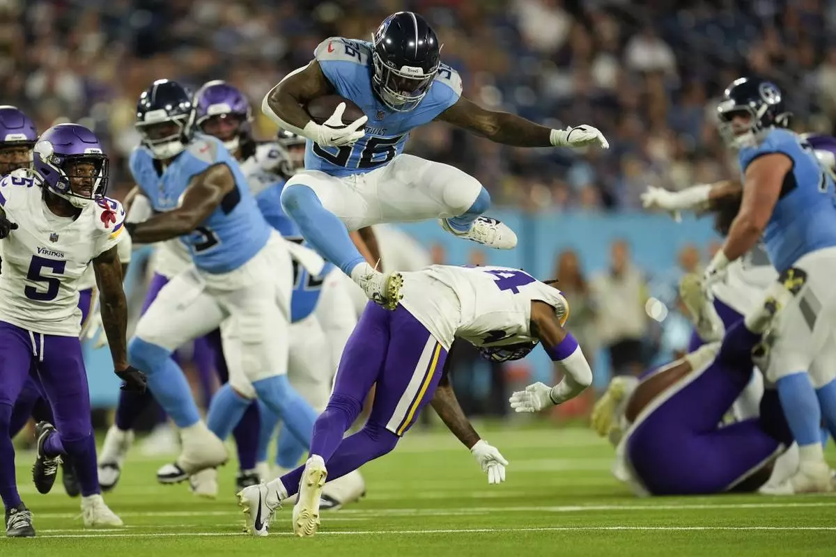 Tennessee Titans running back Julius Chestnut (36) leaps over Minnesota Vikings safety Jay Ward (24) during the first half of a preseason NFL football game, Friday, Aug. 22, 2025, in Nashville, Tenn. (AP Photo/George Walker IV)