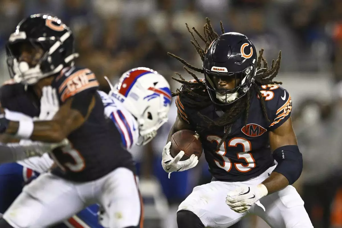 Chicago Bears running back Ian Wheeler (33) rushes for a touchdown in the second half of a preseason NFL football game against the Buffalo Bills Sunday, Aug. 17, 2025, in Chicago. (AP Photo/Paul Beaty)