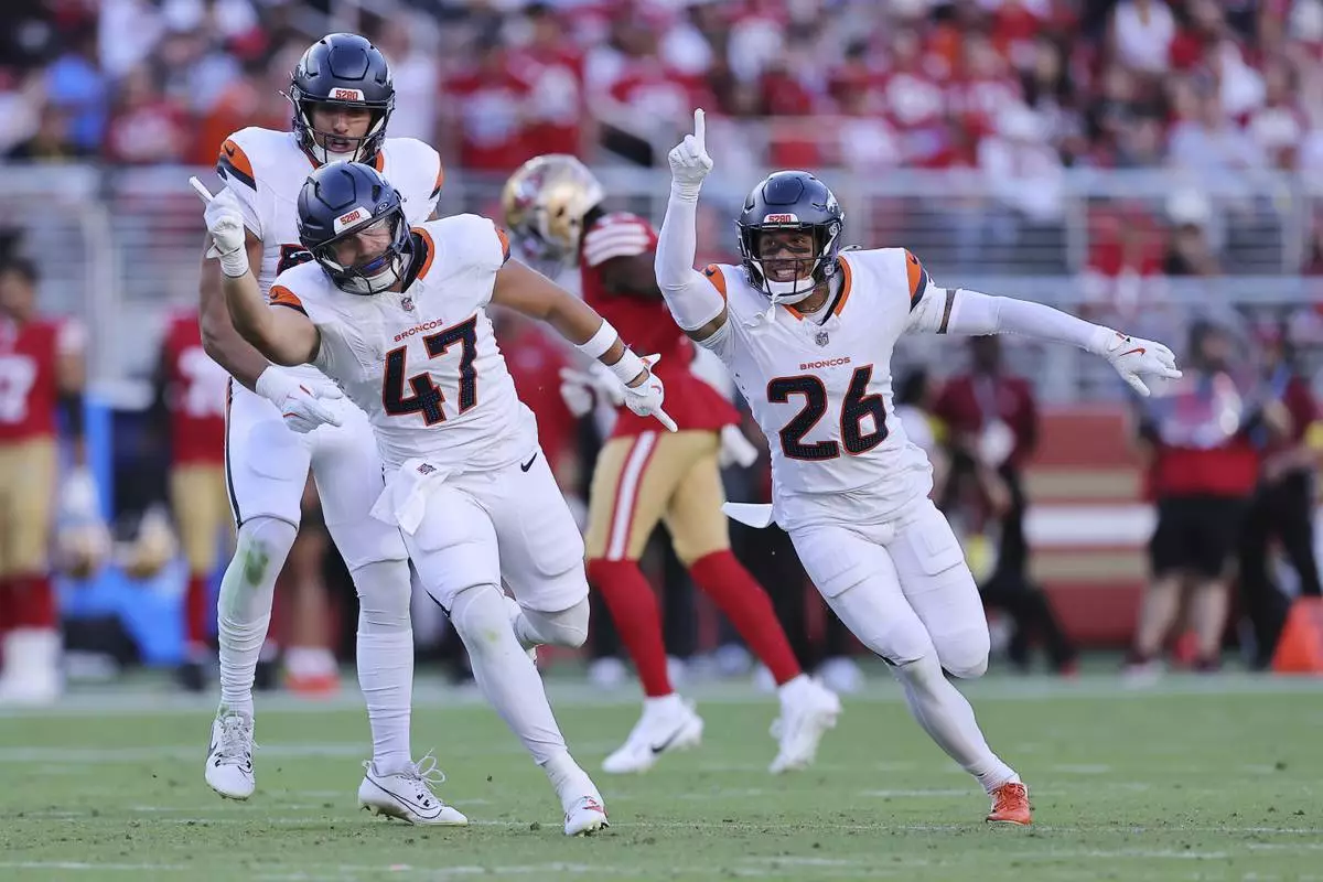 Denver Broncos linebacker Karene Reid (47) celebrates after intercepting a pass during the first half of a preseason NFL football game Saturday, Aug. 9, 2025, in Santa Clara, Calif. (AP Photo/Kelley L Cox)