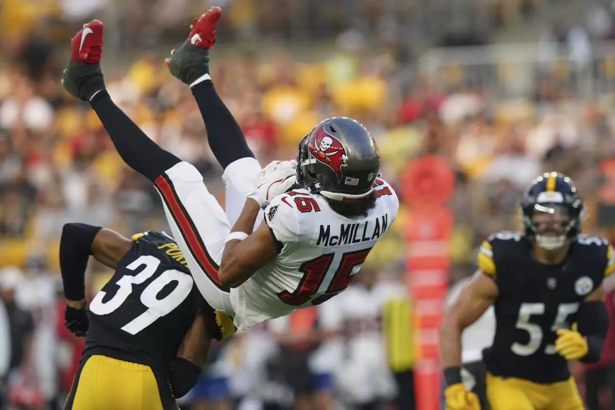 Tampa Bay Buccaneers wide receiver Jalen McMillan (15) is upended by Pittsburgh Steelers cornerback Daryl Porter Jr. (39) after making a catch during the first half of an NFL football preseason game, Saturday, Aug. 16, 2025 in Pittsburgh. (AP Photo/Matt Freed)