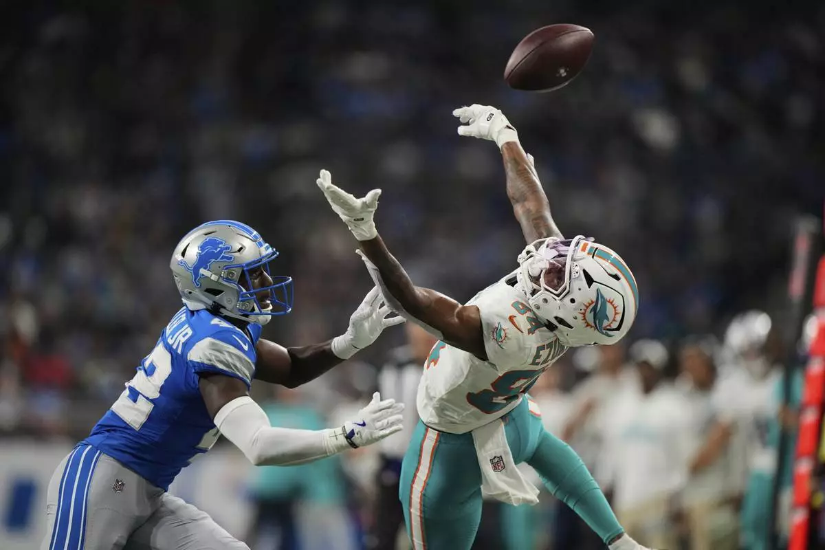 Miami Dolphins wide receiver Erik Ezukanma (84) leaps for a pass against Detroit Lions cornerback D.J. Miller Jr. (42) during the first half of an NFL preseason football game Saturday, Aug. 16, 2025, in Detroit. (AP Photo/Ryan Sun)