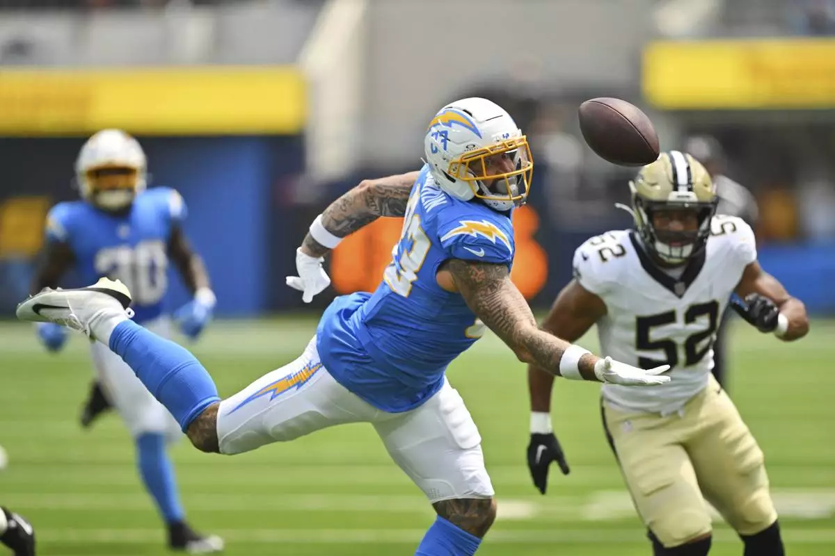 Los Angeles Chargers tight end Tyler Conklin (83) reaches but cannot make a catch in front of New Orleans Saints linebacker D'Marco Jackson (52) during the first half of a preseason NFL football game Sunday, Aug. 10, 2025, in Inglewood, Calif. (AP Photo/Jayne Kamin- Oncea)
