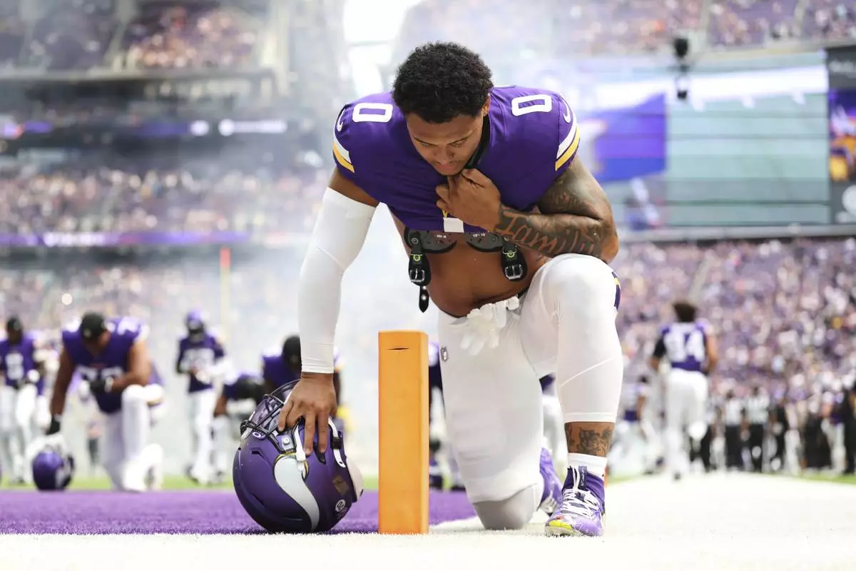 Minnesota Vikings linebacker Ivan Pace Jr. kneels before an NFL preseason football game against the Houston Texans, Saturday, Aug. 9, 2025, in Minneapolis. (AP Photo/Matt Krohn)
