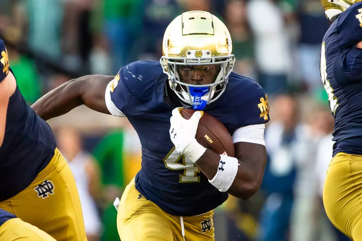 FILE - Notre Dame running back Jeremiyah Love (4) runs the ball during the second half of an NCAA college football game against Stanford, Saturday, Oct. 12, 2024, in South Bend, Ind. (AP Photo/Michael Caterina, File)