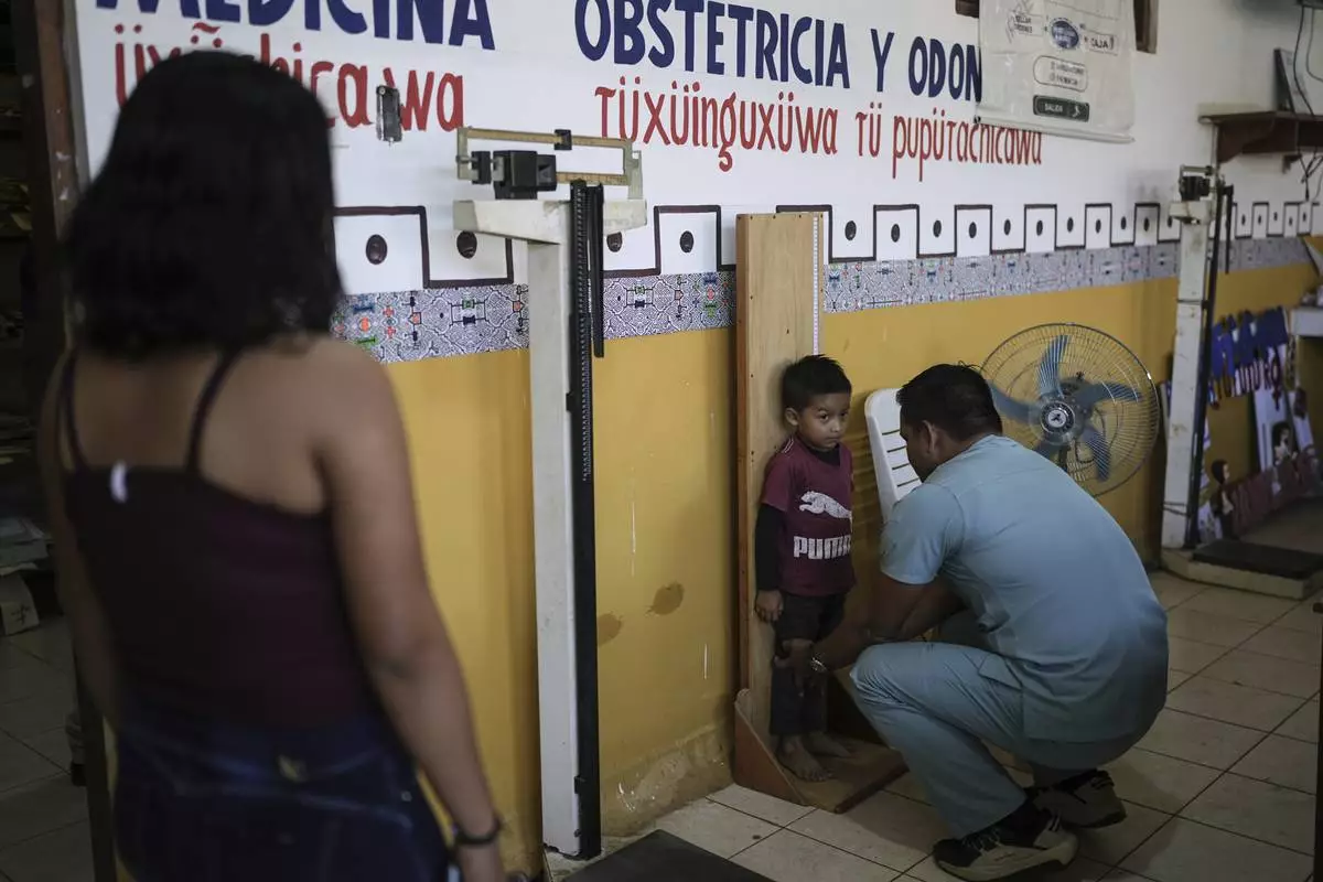 A doctor measures a child's height at the health center in Santa Rosa, Peru, an island on the Amazon River at the triple border with Colombia and Brazil, Monday, Aug. 18, 2025.(AP Photo/Ivan Valencia)