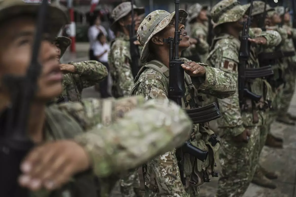 Peruvian soldiers form ranks during a flag ceremony in Santa Rosa, Peru, an island on the Amazon River at the center of a territorial dispute with Colombia, Sunday, Aug. 17, 2025. (AP Photo/Ivan Valencia)