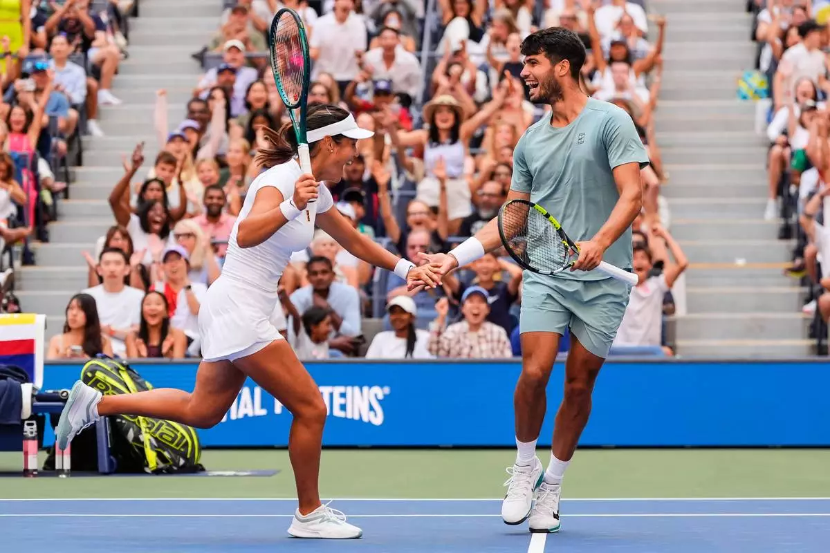 Carlos Alcaraz, right, of Spain, and Emma Raducanu, left, of Great Britain, celebrate during their mixed doubles match at the U.S. Open tennis championships, Tuesday, Aug. 19, 2025, in New York. (AP Photo/Yuki Iwamura)