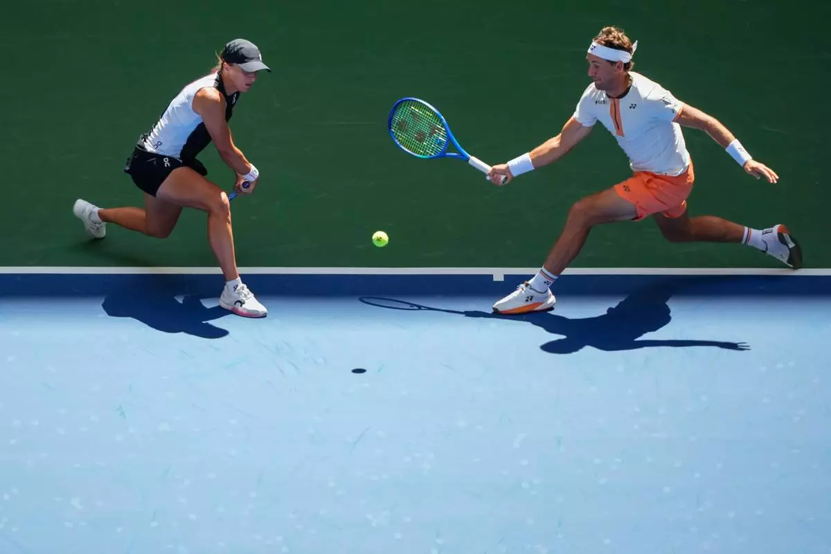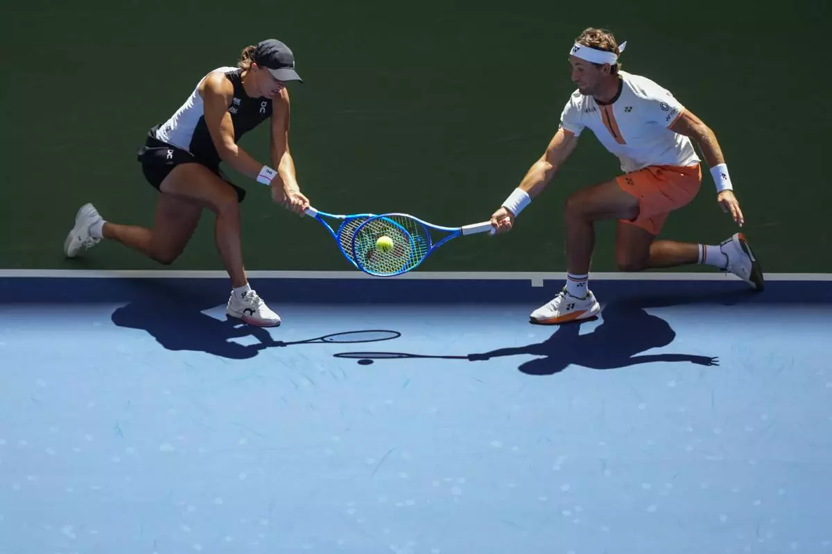 Casper Ruud, of Norway, left, plays a shot as partner Iga Swiatek, left, of Poland, covers during their mixed doubles match at the U.S. Open tennis championships, Tuesday, Aug. 19, 2025, in New York. (AP Photo/Yuki Iwamura)