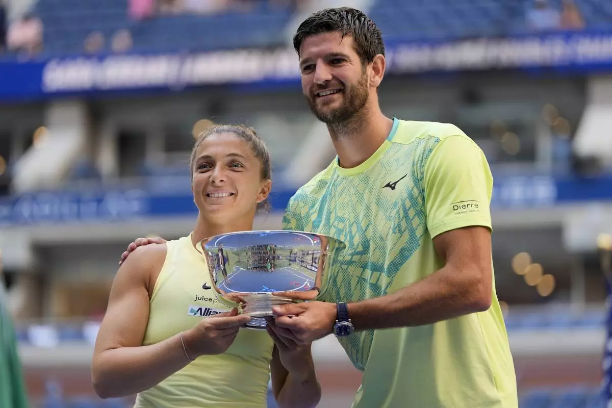 FILE - Sara Errani, of Italy, and Andrea Vavassori, of Italy, hold up the championship trophy after defeating Taylor Townsend, of the United States, and Donald Young, of the United States, in the mixed doubles final of the U.S. Open tennis championships, Thursday, Sept. 5, 2024, in New York. (AP Photo/Julia Nikhinson, File)