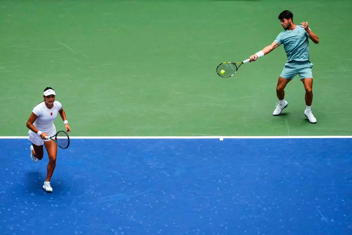 Carlos Alcaraz, right, of Spain, plays a shot as partner Emma Raducanu, of Great Britain, covers during their mixed doubles match at the U.S. Open tennis championships, Tuesday, Aug. 19, 2025, in New York. (AP Photo/Yuki Iwamura)