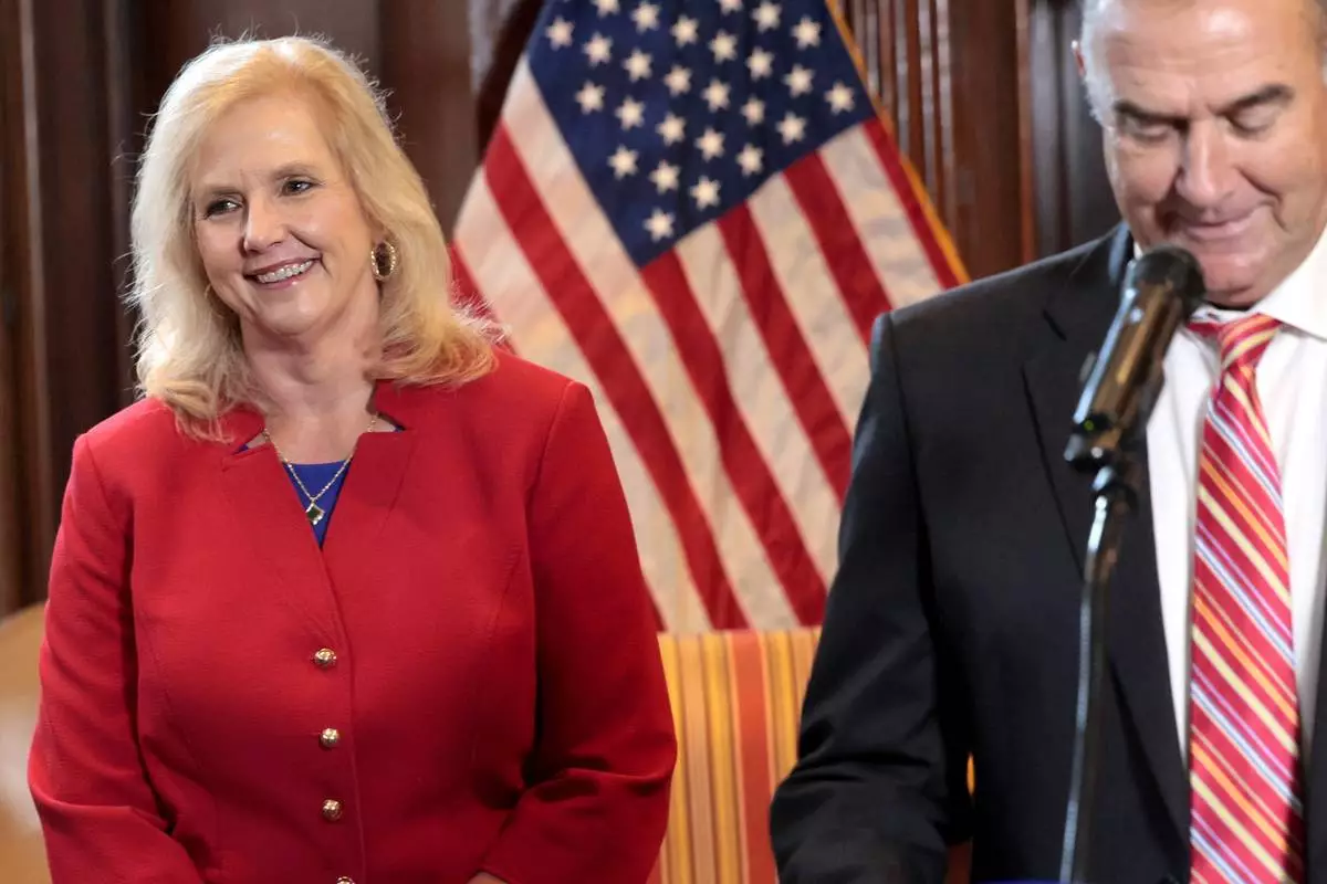 Catherine Hanaway reacts as Gov. Mike Kehoe announces her as the next Missouri Attorney General on Tuesday, Aug. 19, 2025, during a press conference in his office at the Capitol in Jefferson City. (Laurie Skrivan/St. Louis Post-Dispatch via AP)