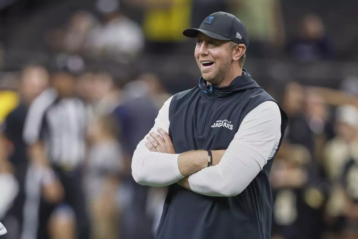 Jacksonville Jaguars head coach Liam Coen watches players warm up before an NFL preseason football game against the New Orleans Saints in New Orleans, Sunday, Aug. 17, 2025. (AP Photo/Butch Dill)