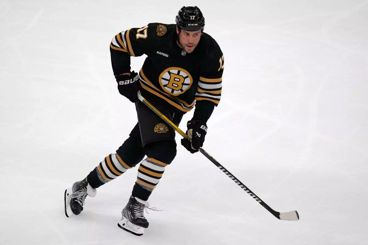 FILE - Boston Bruins left wing Milan Lucic (17) skates during a hockey game, Tuesday, Oct. 3, 2023, in Boston. (AP Photo/Charles Krupa, File)