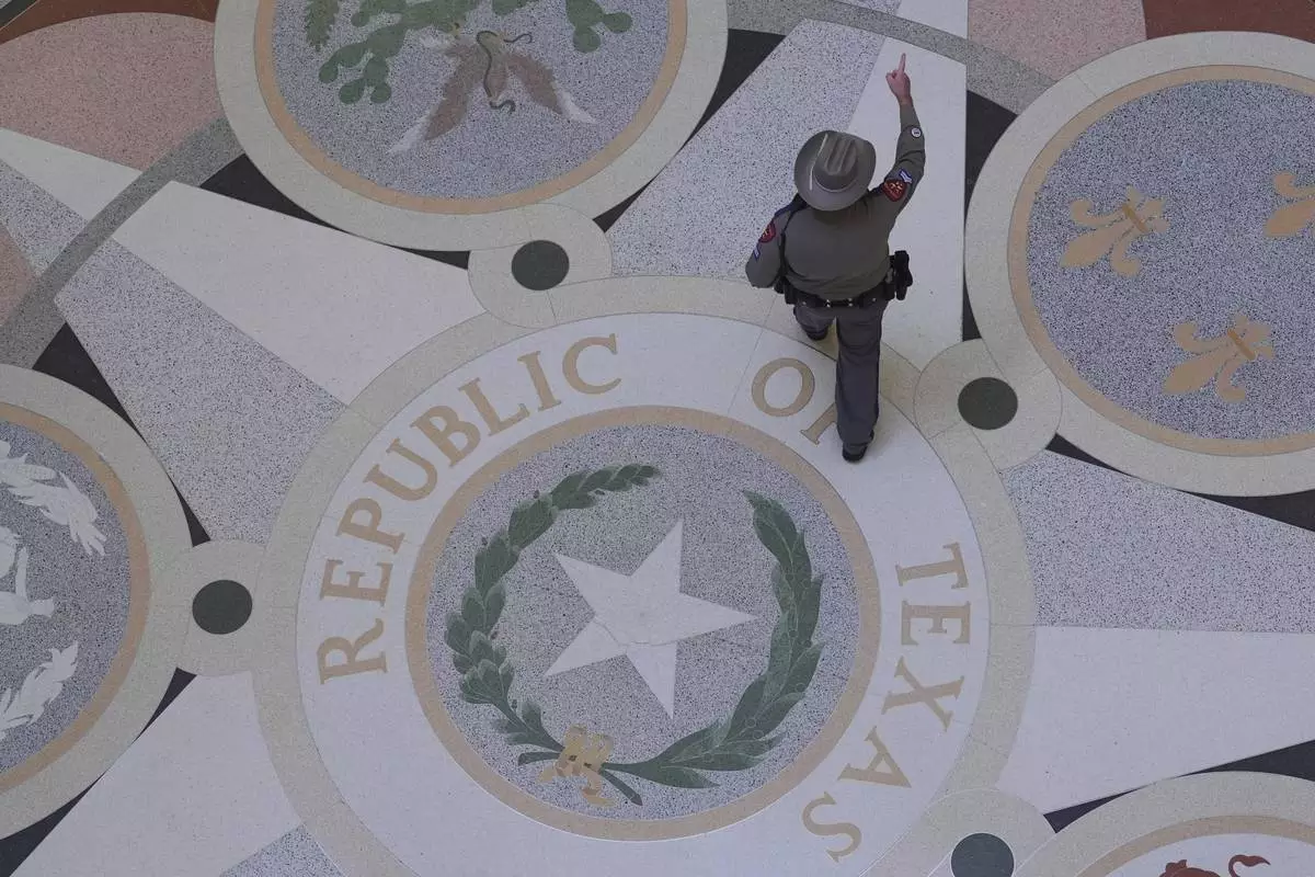 A Texas troopers passes the Texas Seal on the Rotunda of the Texas Capitol before debate on a bill for a redrawn U.S. congressional map during a special session in the Senate Chamber in Austin, Texas, Friday, Aug. 22, 2025. (AP Photo/Eric Gay)