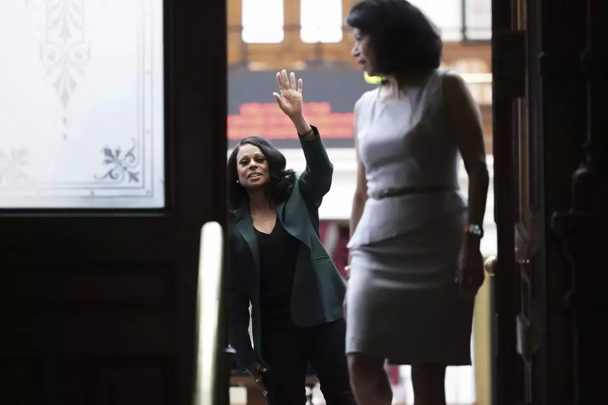 Texas state Rep. Nicole Collier, left, waves past Texas state Sen. Carol Alvarado, right, to supporters outside of the House Chamber where she refuses to leave due to a required law enforcement escort, Tuesday, Aug. 19, 2025, in Austin, Texas. (AP Photo/Eric Gay)